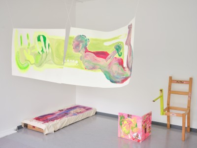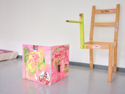Acryl, Öl und Collage auf Stuhl